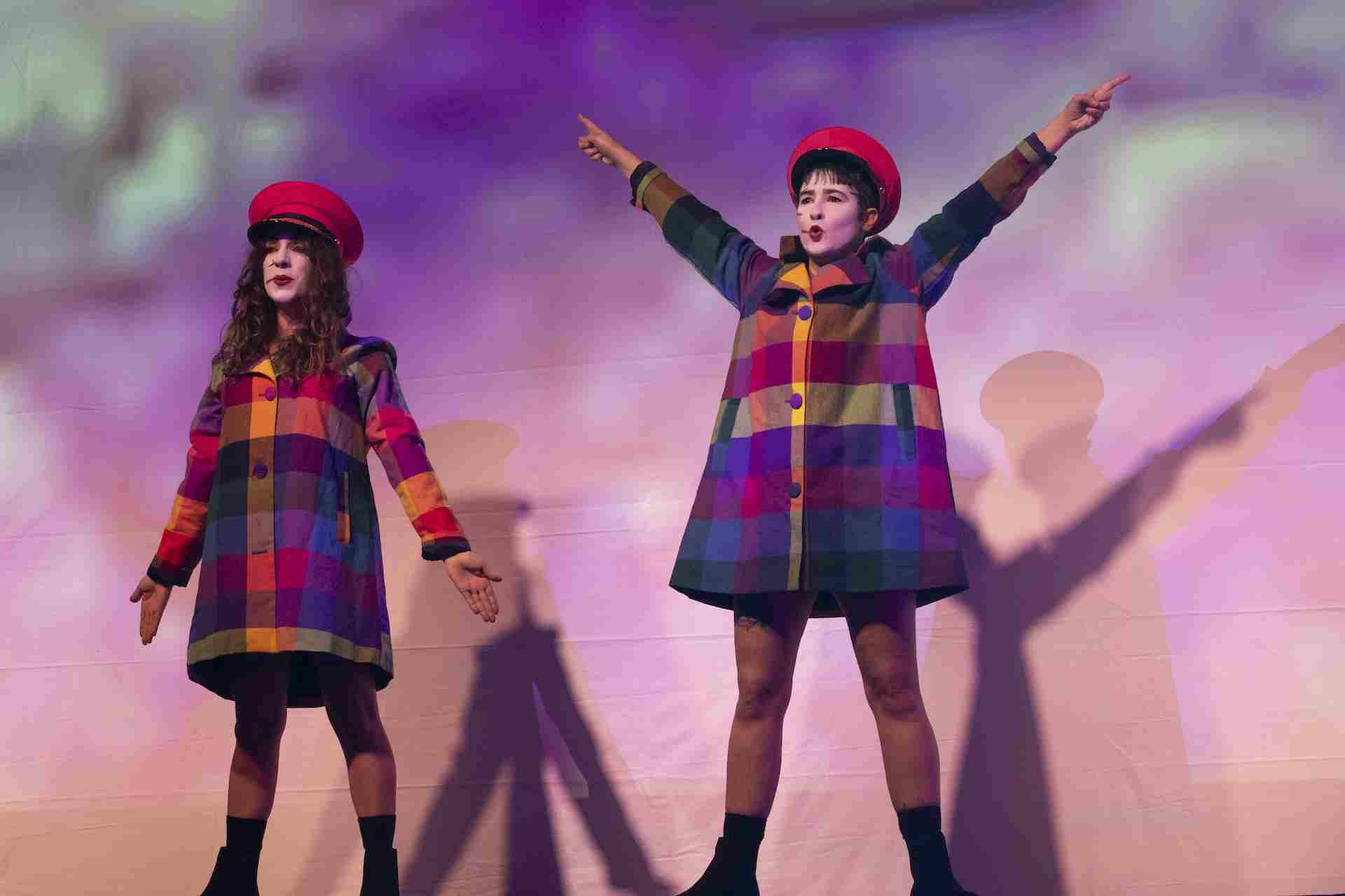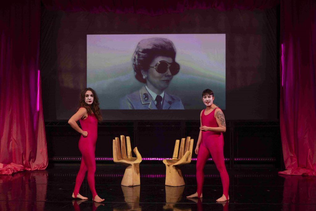 Mientras las actrices se visten con enteritos de lycra color fucsia, nos adentramos en la historia que nos convoca. Bizarramente representados en una pantalla gigante, Isabel y Perón en monocromo, sentados en un sillón, hablando y riéndose con bocas de collage. Para conocer a la protagonista de la noche, Isabel Perón, viajamos al Happy Land, un local nocturno en Panamá —que es un país, aclaran, y un sombrero—. Rebecca y Louise se encargan de llevarnos por la vida de una mujer para quien, tal vez, lo más difícil no haya sido la política en sí misma, sino el hecho de no haber podido nunca superar a su predecesora, Evita. Y es aquí donde entramos en el segundo paralelismo de la noche, esta vez entre la obra de S!hit Theatre, Evita Too, y la multipremiada Evita de Andrew Lloyd Webber.