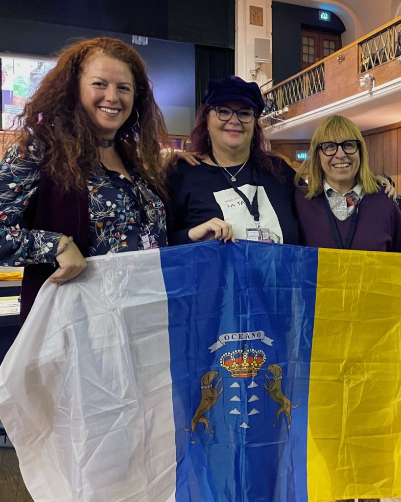 Futura es el lema. Autores y autoras entramos al edificio con los sueños en maletas, mochilas y bolsillos. Los organizadores nos reciben con amplias sonrisas y nos dan la bienvenida. Entro en una sala de pasillos de mesas en paralelo y en perpendicular. Algarabía de letras, de libros, de escritores, traductores, ilustradores, editores, libreros y expositores. Pronto me encuentro con mis compañeras canarias de letras Josefa Molina y Fuen de la Cruz. Sobre mesas con manteles negros colocamos nuestros libros.
